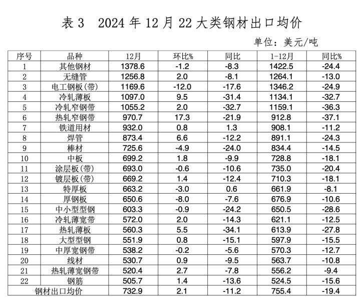 根据中国钢铁工业协会的统计,2024年1-12月,我国累计出口钢材11071.6万吨,达历史第二高位,同比增长22.7%,但出口均价755.4美元/吨,同比下降19.4%。