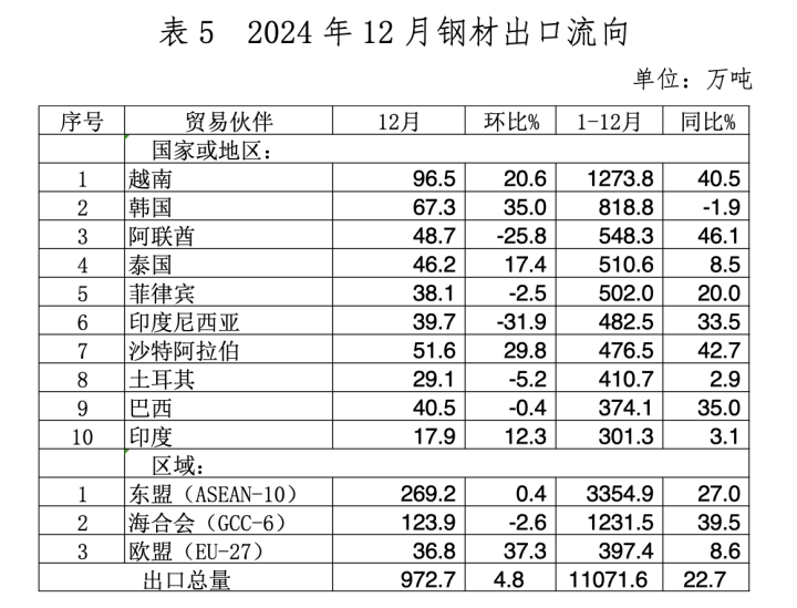 2月21日,越南宣布对中国输越钢铁产品征收19.38%、26.94%和27.83%共3档的反倾销税税率。而越南和韩国正是2024年我国钢铁出口规模居前两位的两个目的地。