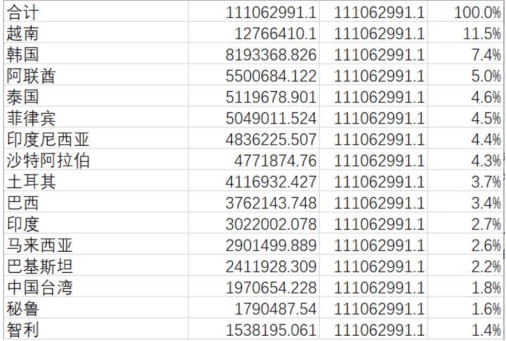 据记者了解,今年不少国内钢厂依然希望加大钢材的出口,不过目前对美国的出口占比已经很小,更多的钢铁产品是直接出口到东盟和海合会国家,比如2024年,中国的钢铁产品出口到越南的最多,其次是韩国和阿联酋。